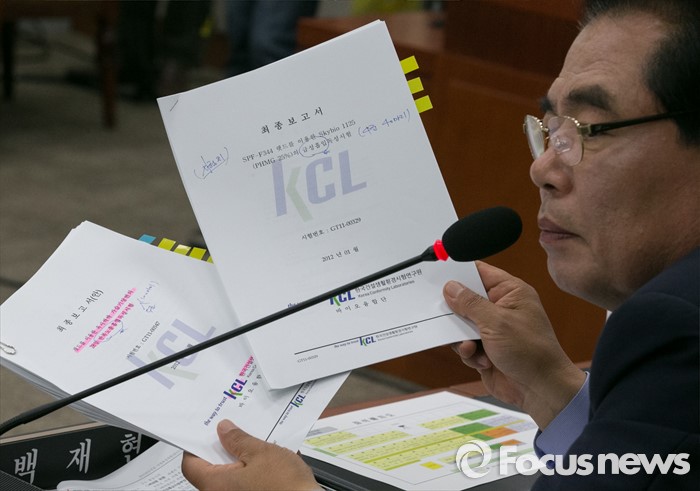 (서울=포커스뉴스) 10일 오후 서울 여의도 국회에서 열린 산업통상자원위원회 전체회의에 참석한 백재현 더불어민주당 의원이 옥시 관련 한국건설생활환경시험연구원(KCL) 보고서를 들고 이관섭 산업통상자원부 1차관에게 질의하고 있다.