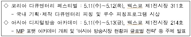 (서울=포커스뉴스) 미래창조과학부는 11일부터 13일까지 부산 벡스코에서 열리는 부산콘텐츠마켓 기간 중 ‘코리아 다큐멘터리 페스티벌’과 ‘아시아 디지털방송 아카데미’를 개최한다.