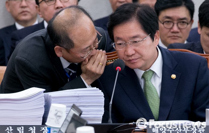 (서울=포커스뉴스) 10일 오후 서울 여의도 국회에서 열린 농림축산식품해양수산위원회 전체회의에 참석한 김영석(오른쪽) 해양수산부 장관이 관계자로부터 보고를 받고 있다. 이날 회의는 세월호 특별법 개정안 내용 중 특조위 활동 기간 연장과 관련 이견으로 여당 의원들이 불참한 채 진행됐다.