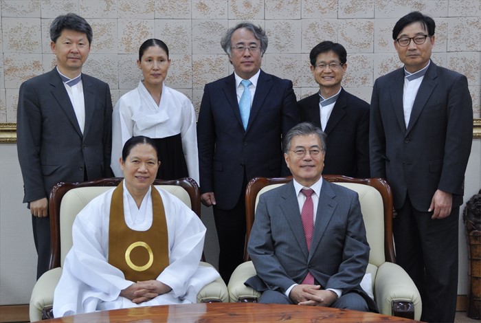 (서울=포커스뉴스) 문재인(앞줄 오른쪽) 더불어민주당 전 대표가 10일 오후 전북 익산시 원불교 총부를 방문해 한은숙(앞줄 왼쪽) 원불교 교정원장과 면담을 마친 뒤 관계자들과 함께 기념촬영을 하고 있다. <사진제공=원불교중앙총부>