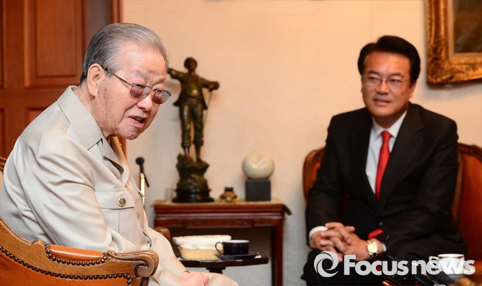 (서울=포커스뉴스) 정진석(오른쪽) 새누리당 원내대표가 10일 오후 서울 중구 김종필 전 총리 자택을 방문해 김 전 총리와 환담을 하고 있다.