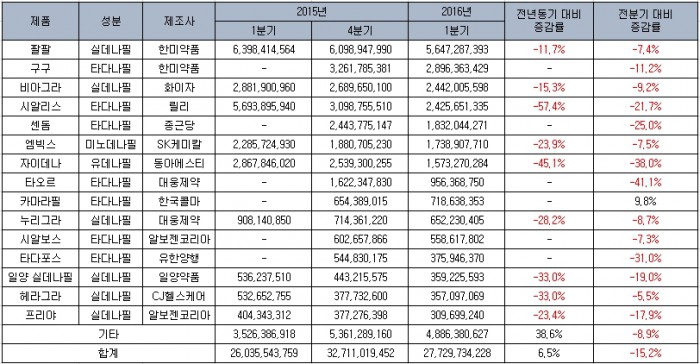 반대로 비아그라와 시알리스의 시장점유율은 매 분기마다 감소하는 추세다.
