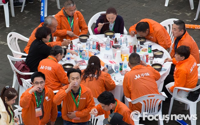 (서울=포커스뉴스) 10일 오후 서울 서초구 반포한강공원에서 중국 건강보조제품 회사 중마이과기발전유한공사 소속 임직원들이 삼계탕 만찬을 즐기고 있다.