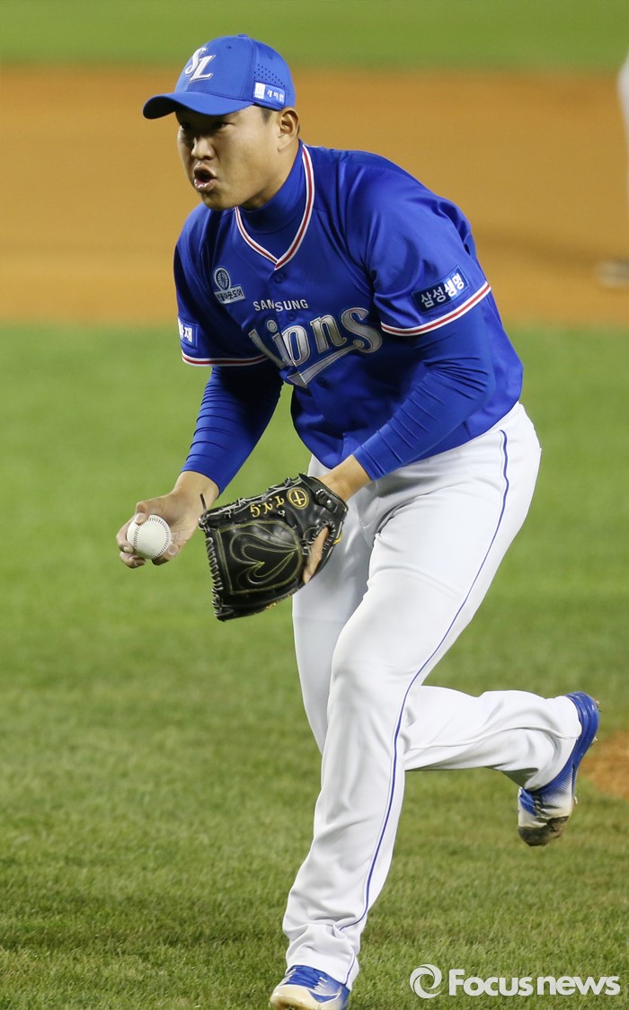 (서울=포커스뉴스) 10일 서울 잠실구장에서 열린 2016 프로야구 삼성-LG 경기 6회말 1사 만루에서 삼성 투수 김동호가 LG 히메네스의 투수앞 땅볼을 잡아 홈으로 토스하고 있다.