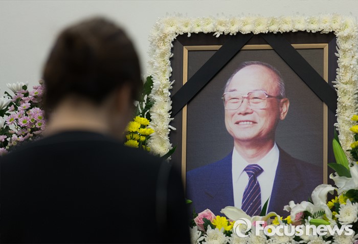 (서울=포커스뉴스) 10일 오후 서울 송파구 서울아산병원 장례식장에 마련된 故 강영훈 전 국무총리의 빈소에서 한 조문객이 조문하고 있다.