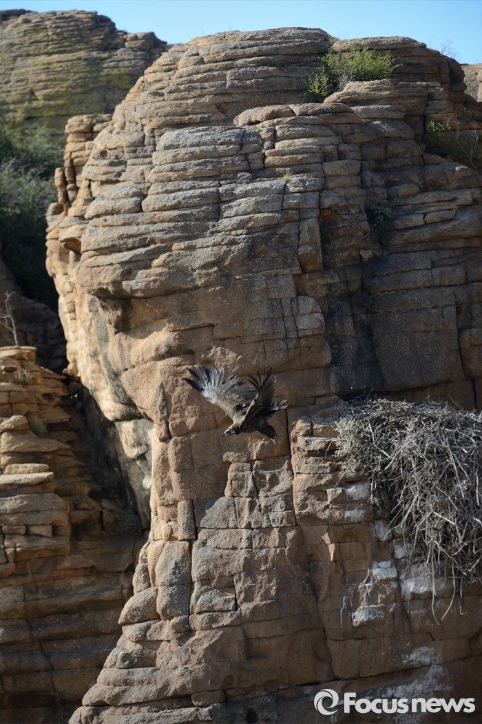 (바가 가즈링 촐로/몽골=포커스뉴스)겨울철 한국을 찾는 독수리(천연기념물 243호)가 몽골 바가 가즈링촐로 암벽지대 둥지에서 먹이를 찾아 나서고 있다.