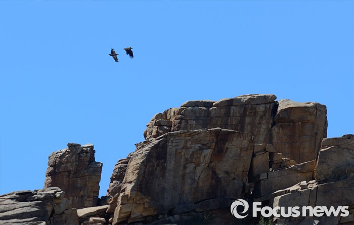 (바가 가즈링 촐로/몽골=포커스뉴스)각진 돌을 쌓아 올린 듯한 바가 가즈링 촐로 의 고지대에 둥지를 튼 독수리들이 먹이를 찾으러 들녘으로 날아가고 있다.