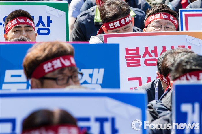 (서울=포커스뉴스) 11일 오전 서울 영등포구 여의도 국민은행 앞에서 양대노총 공공부문 공대위 주최로 열린 '성과연봉제ㆍ강제퇴출제 저지 천막농성' 돌입집회 참가자들이 손팻말을 들고 있다.