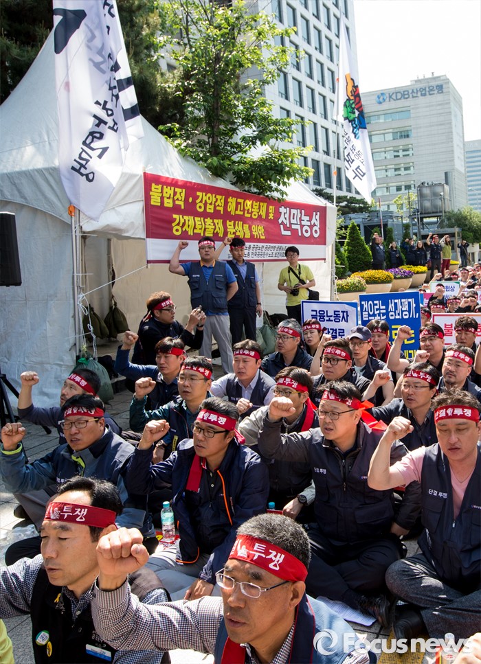 (서울=포커스뉴스) 11일 오전 서울 영등포구 여의도 국민은행 앞에서 양대노총 공공부문 공대위 주최로 열린 '성과연봉제ㆍ강제퇴출제 저지 천막농성' 돌입집회 참가자들이 구호를 외치고 있다.