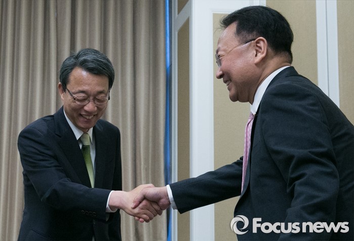 (서울=포커스뉴스) 김성식(왼쪽) 국민의당 정책위의장이 11일 오전 서울 여의도 국회 귀빈식당에서 유일호 경제부총리 겸 기획재정부 장관을 만나 인사를 하고 있다.