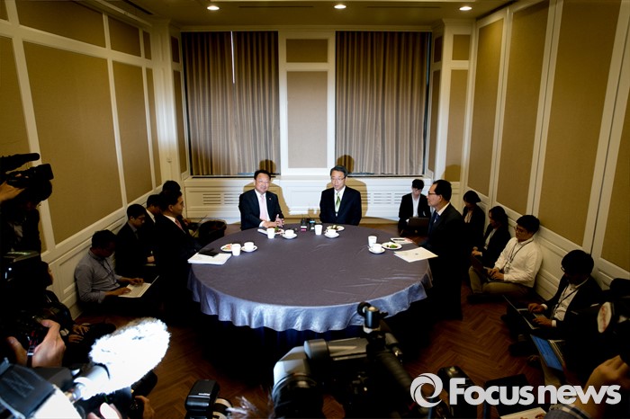 (서울=포커스뉴스) 김성식(오른쪽) 국민의당 정책위의장이 11일 오전 서울 여의도 국회 귀빈식당에서 유일호 경제부총리 겸 기획재정부 장관을 만나 면담을 하고 있다.