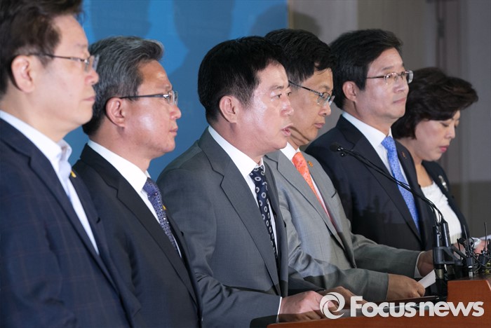 (서울=포커스뉴스) 경기도 6개 기초단체장이 11일 오전 서울 여의도 국회 정론관에서 조정교부금 배분제도 변경에 따른 입장발표 기자회견을 마친 뒤 취재진 질문에 답하고 있다. 왼쪽부터 이재명 성남시장, 채인석 화성시장, 신계용 과천시장, 염태영 수원시장, 최성 고양시장, 정찬민 용인시장.