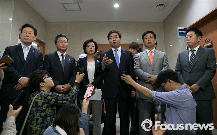 (서울=포커스뉴스) 경기도 6개 기초단체장이 11일 오전 서울 여의도 국회 정론관에서 조정교부금 배분제도 변경에 따른 입장발표 기자회견을 마친 뒤 취재진 질문에 답하고 있다. 왼쪽부터 이재명 성남시장, 채인석 화성시장, 신계용 과천시장, 염태영 수원시장, 최성 고양시장, 정찬민 용인시장.