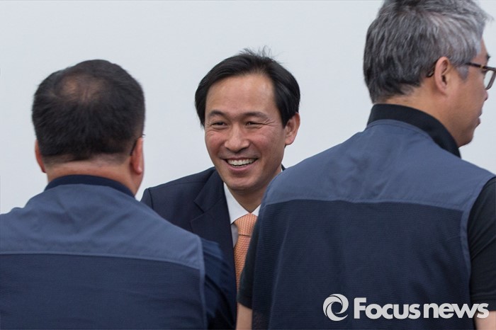 (서울=포커스뉴스) 우상호 더불어민주당 원내대표가 11일 오전 서울 여의도 국회에서 열린 전국금융산업노조 간담회에 참석한 노조원들과 악수 하고 있다.