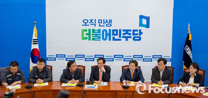 (서울=포커스뉴스) 김문호(왼쪽 세 번째) 전국금융산업노동조합 위원장이 11일 오전 서울 여의도 국회에서 열린 '더불어민주당-전국금융산업노조 간담회'에서 모두발언 하고 있다.