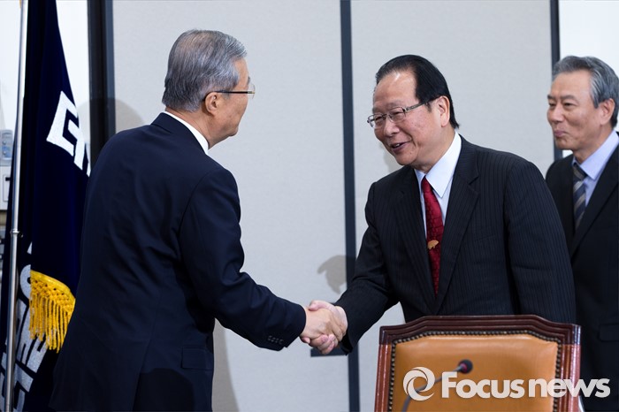 (서울=포커스뉴스) 김종인(왼쪽) 더불어민주당 비상대책위 대표와 린더푸 대한-한 의원친선협회장이 11일 오전 서울 여의도 국회에서 면담에 앞서 악수 하고 있다.