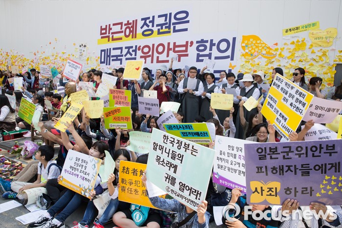 (서울=포커스뉴스) 11일 오후 서울 종로구 옛 주한일본대사관 앞에서 한국정신대문제대책협의회와 학생들이 '일본군 위안부 문제해결을 위한 정기 수요시위'를 하고 있다.