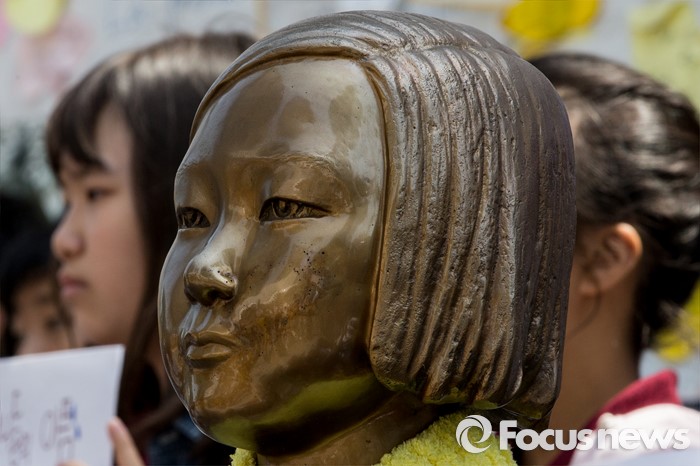 (서울=포커스뉴스) 11일 오후 서울 종로구 옛 주한일본대사관 앞에서 한국정신대문제대책협의회와 학생들이 '일본군 위안부 문제해결을 위한 정기 수요시위'를 하고 있다.