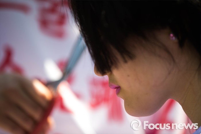 (서울=포커스뉴스) 11일 오전 서울 관악구 서울대학교 앞에서 사시존치를위한고시생모임 회원 황지나씨가 교육부의 전수조사 결과 발표를 규탄하며 삭발식을 하고 있다.