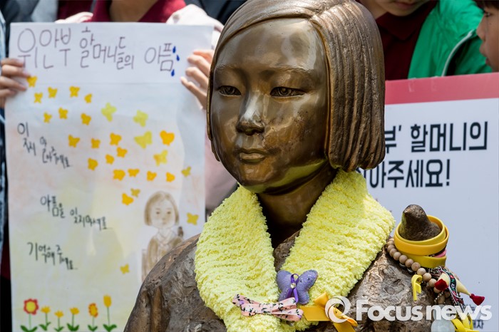 (서울=포커스뉴스) 11일 오후 서울 종로구 옛 주한일본대사관 앞에서 한국정신대문제대책협의회와 학생들이 '일본군 위안부 문제해결을 위한 정기 수요시위'를 하고 있다.
