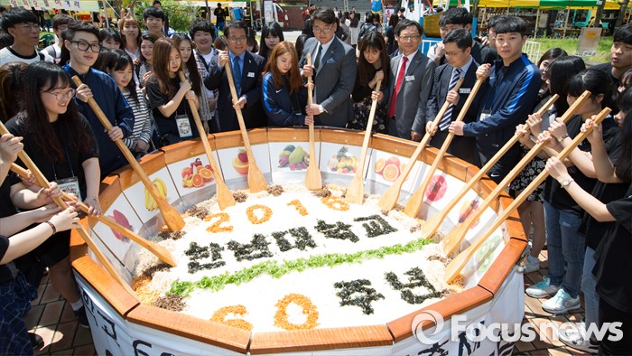 (대전=포커스뉴스) 11일 오전 대전 대덕구 한남대학교에서 이덕훈 총장과 학생들이 개교 60주년 기념 대형 비빔밥을 학생들에게 나눠주는 행사를 갖고 있다.