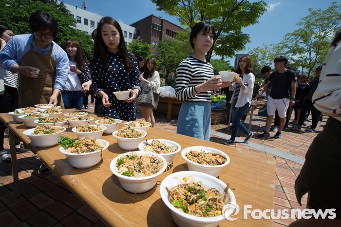 (대전=포커스뉴스) 11일 오전 대전 대덕구 한남대학교에서 이덕훈 총장과 학생들이 개교 60주년 기념 대형 비빔밥을 학생들에게 나눠주는 행사를 갖고 있다.