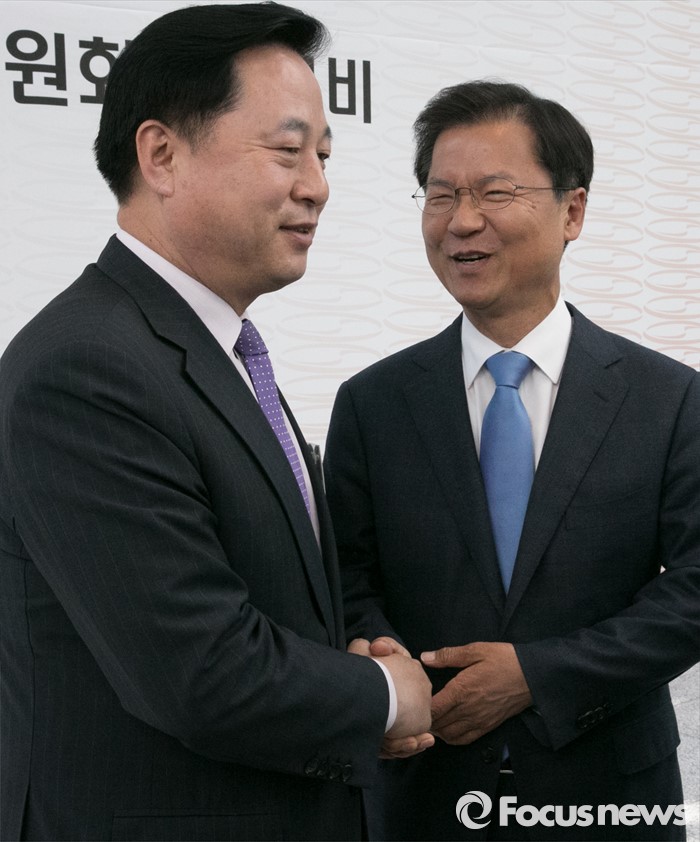 (서울=포커스뉴스) 11일 오후 서울 여의도 국회 의원회관에서 열린 20대 국회 초선의원 의정연찬회 오찬에 참석한 김두관(왼쪽) 더불어민주당 당선인과 천정배 국민의당 공동대표가 인사하고 있다.