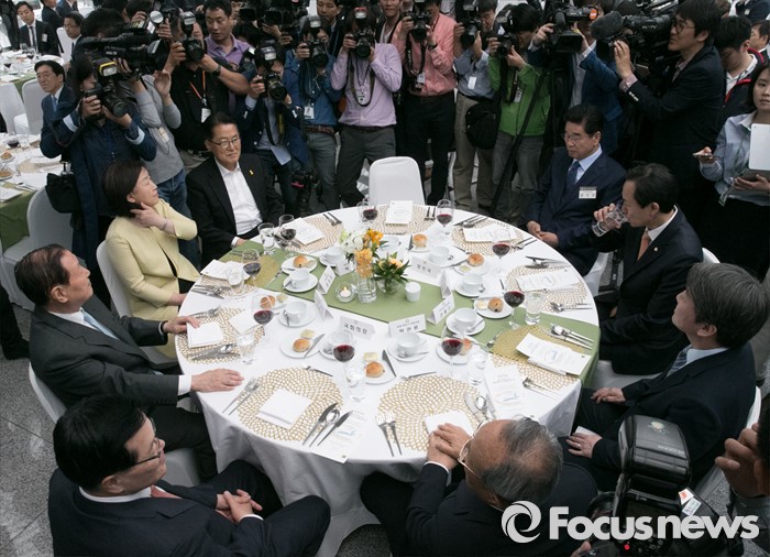 (서울=포커스뉴스) 11일 오후 서울 여의도 국회 의원회관에서 열린 20대 국회 초선의원 의정연찬회 오찬에 참석한 내빈들이 자리하고 있다. 왼쪽 위부터 반시계 방향으로 박지원 국민의당 원내대표, 심상정 정의당 상임대표, 김원기 전 국회의장, 정의화 국회의장, 박관용 전 국회의장, 안철수 국민의당 상임공동대표, 우상호 더불어민주당 원내대표, 문진국 새누리당 당선인.