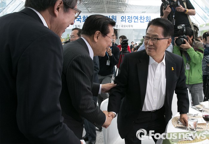 (서울=포커스뉴스) 11일 오후 서울 여의도 국회 의원회관에서 열린 20대 국회 초선의원 의정연찬회 오찬에 참석한 박지원(오른쪽부터) 국민의당 원내대표, 박준영 당선인, 박형준 국회 사무총장이 인사하고 있다.