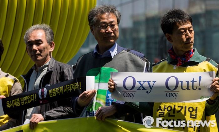 (서울=포커스뉴스)영국과 덴마크에서 옥시레킷벤키저 본사와 케톡스 본사를 항의 방문했던 가습기 살균제 피해자 유족과 시민단체가 11일 오후 서울 영등포구 여의도 옥시 한국본사 앞에서 열린 귀국 기자회견에 참석해 옥시를 규탄하는 손팻말을 들고 있다.