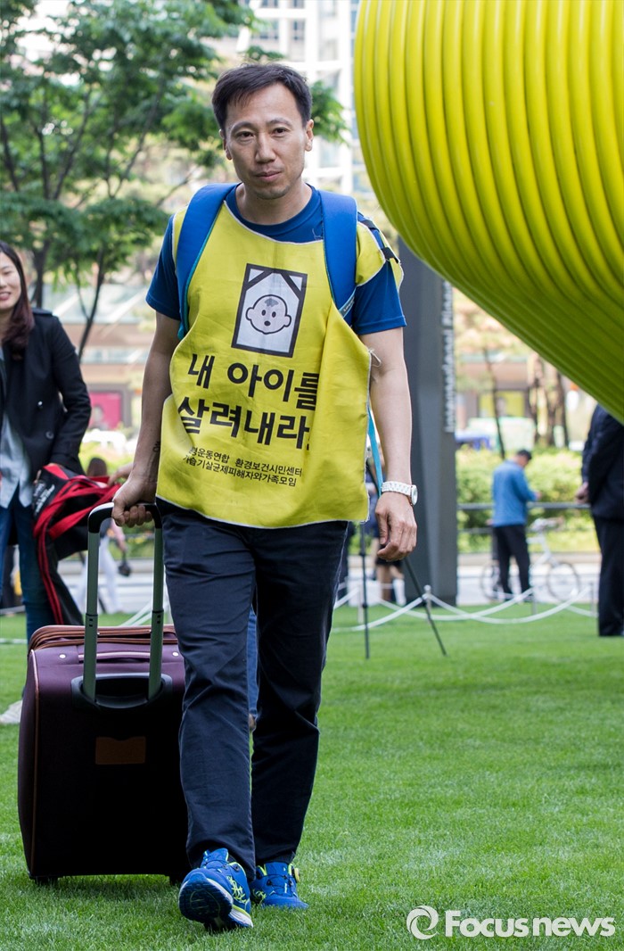 (서울=포커스뉴스)영국과 덴마크에서 옥시레킷벤키저 본사와 케톡스 본사를 항의 방문했던 가습기 살균제 피해자 유족 김덕종(40)씨가 11일 오후 서울 영등포구 여의도 옥시 한국본사 앞에서 열린 귀국 기자회견을 마친 후 발걸음을 옮기고 있다.