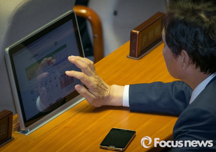 (서울=포커스뉴스) 11일 오후 서울 여의도 국회 본회의장을 방문한 한 20대 국회 초선 당선인이 전자투표 시연 등 교육을 듣던 중 웹서핑을 하고 있다.