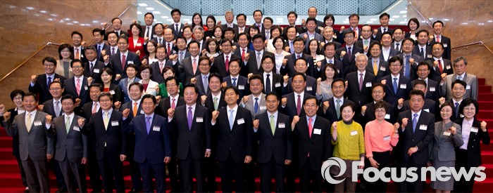 (서울=포커스뉴스) 11일 오후 서울 여의도 국회 로텐더홀 계단에서 20대 국회 초선 당선인들이 전자투표 시연 등 교육을 마친 뒤 기념촬영을 하고 있다.