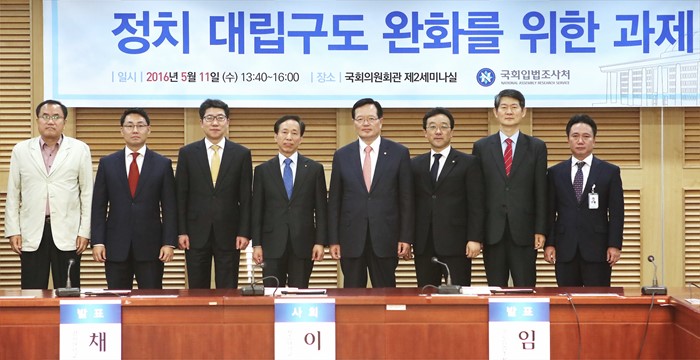 (서울=포커스뉴스) 정의화(오른쪽 네번째) 국회의장이 11일 오후 서울 여의도 국회 의원회관에서 열린 '정치 대립구도 완화를 위한 과제' 학술회의에 참석해 임성호(오른쪽 세번째) 국회입법조사처장 등 참석자들과 기념촬영을 하고 있다. <사진제공=국회>