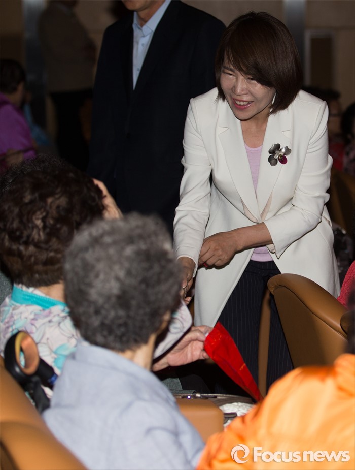 (서울=포커스뉴스) 11일 오후 서울 강남구 코엑스에서 열린 제44회 어버이날 기념 효드림 축제에 참석한 전현희 더불어민주당 강남을 당선인이 어르신들께 인사하고 있다.