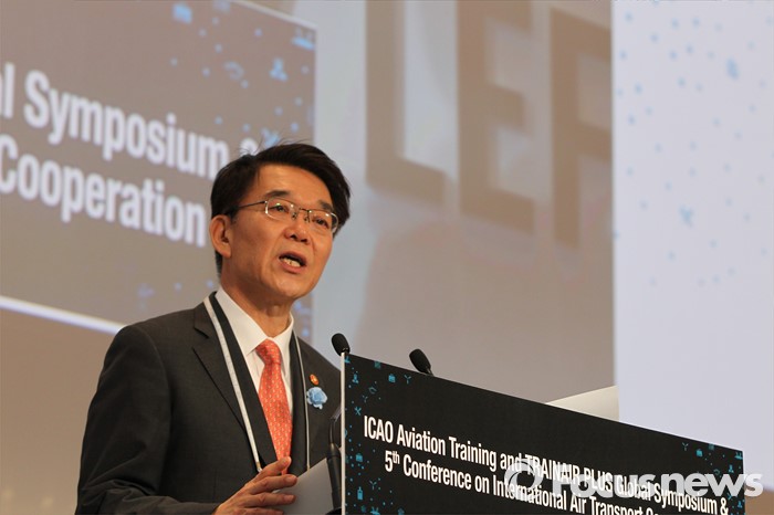 (서울=포커스뉴스) 강호인 국토교통부장관이 11일 서울 콘래드호텔에서 열린 제5차 국제항공협력컨퍼런스 & ICAO TRAINAIR PLUS 심포지엄에 참석해 인사말을 하고 있다. <사진제공=국토교통부>