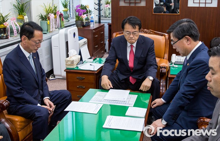 (서울=포커스뉴스) 정진석(가운데) 새누리당 원내대표가 11일 오후 서울 여의도 국회에서 이기권(오른쪽 두 번째) 고용노동부 장관에게 노동개혁 관련 주요 현안 보고를 받고 있다.