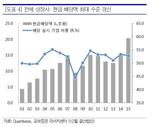 강송철 한국투자증권 연구원은 “국내기업이 배당을 늘리는 가장 큰 배경은 ‘저성장, 저금리 환경’으로 판단한다”며 “국내적 요인으로는 정부 정책이 있고, 이는 올해와 내년에도 기업의 배당 증가 유인이 될 것”이라고 예상했다.