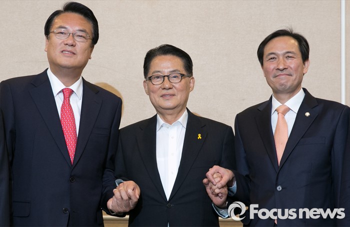 (서울=포커스뉴스) 11일 오후 서울 여의도 국회 귀빈식당에서 열린 3당 원내지도부 회동에 참석한 정진석(왼쪽부터) 새누리당 원내대표, 박지원 국민의당 원내대표, 우상호 더불어민주당 원내대표가 취재진을 향해 포즈를 취하고 있다.