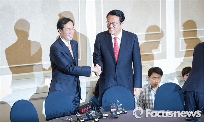 (서울=포커스뉴스) 우상호(왼쪽) 더불어민주당 원내대표와 정진석 새누리당 원내대표가 11일 오후 서울 여의도 국회 귀빈식당에서 열린 3당 원내지도부 회동에 참석해 인사를 나누고 있다.