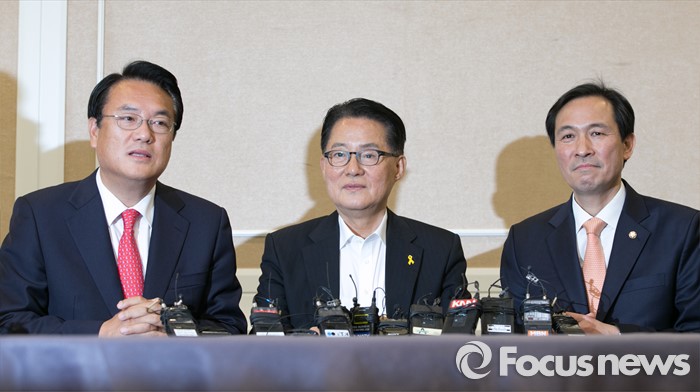(서울=포커스뉴스) 11일 오후 서울 여의도 국회 귀빈식당에서 열린 3당 원내지도부 회동에 참석한 정진석 새누리당 원내대표가 모두발언을 하고 있다. 왼쪽부터 정 원내대표, 박지원 국민의당 원내대표, 우상호 더불어민주당 원내대표.