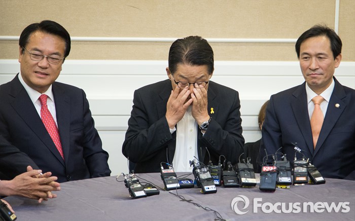 (서울=포커스뉴스) 정진석(왼쪽) 새누리당 원내대표, 박지원(가운데) 국민의당 원내대표, 우상호 더불어민주당 원내대표가 11일 오후 서울 여의도 국회 귀빈식당에서 열린 회동에 참석해 자리하고 있다.