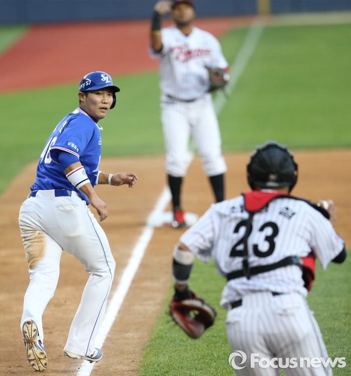 (서울=포커스뉴스) 11일 서울 잠실구장에서 열린 2016 프로야구 삼성-LG 경기 3회초 무사 1,3루에서 삼성 3루주자 이흥련이 배영섭의 3루땅볼때 홈으로 뛰다 런다운에 걸려 아웃되고 있다.