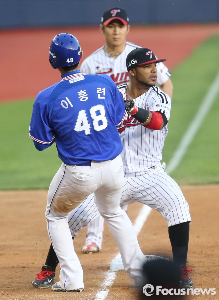 (서울=포커스뉴스) 11일 서울 잠실구장에서 열린 2016 프로야구 삼성-LG 경기 3회초 무사 1,3루에서 삼성 3루주자 이흥련이 배영섭의 3루땅볼때 홈으로 뛰다 런다운에 걸려 아웃되고 있다.