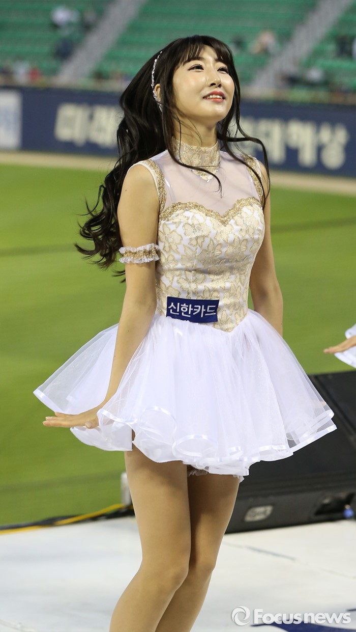 (서울=포커스뉴스) 11일 서울 잠실구장에서 열린 2016 프로야구 삼성-LG 경기에서 LG 치어리더가 순백의 짧은 치마를 입고 정열적인 안무로 관중들의 시선을 모으고 있다.
