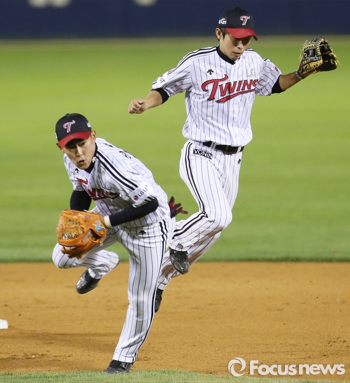 (서울=포커스뉴스) 11일 서울 잠실구장에서 열린 2016 프로야구 삼성-LG 경기 9회초 2사후 LG 2루수 정주현이 삼성 이영욱의 타구를 잡아 1루 송구 채비를 하고 있다. 뒤는 유격수 황목치승.