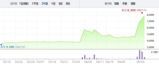 보락은 12일 오전 9시34분 현재 전일 대비 7.47%(550원) 상승한 7910원에 거래되고 있다. 특히 9일에는 주가가 가격제한폭인 29.82%까지 상승하기도 했다. 4월 초 주가(4955원)와 비교했을 때 59.6% 상승한 수치다.