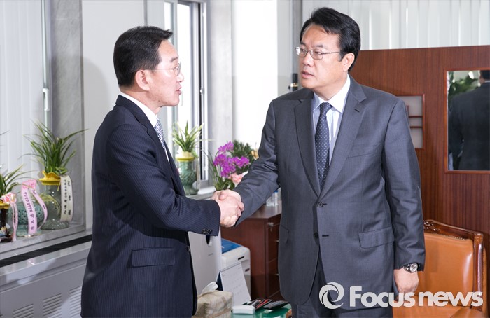 (서울=포커스뉴스) 정진석(오른쪽) 새누리당 원내대표가 12일 오전 서울 여의도 국회를 방문한 현기환 청와대 정무수석과 만나 인사하고 있다.