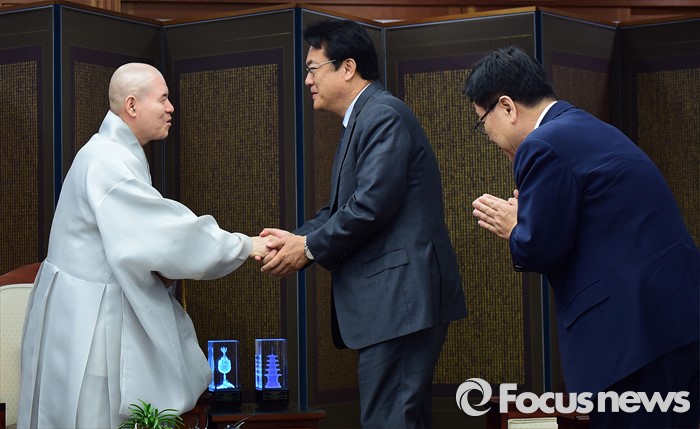 (서울=포커스뉴스) 정진석(오른쪽 두 번째) 새누리당 원내대표가 12일 오전 서울 종로구 조계사에서 자승 대한불교조계종 총무원장을 예방해 인사 하고 있다.