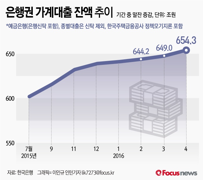 (서울=포커스뉴스) 12일 한국은행은 '2016년 4월 중 금융시장 동향'을 통해 올해 4월 은행권 가계대출 잔액이 654조3000억원으로 전월 대비 5조3000억원 늘었다고 밝혔다.
